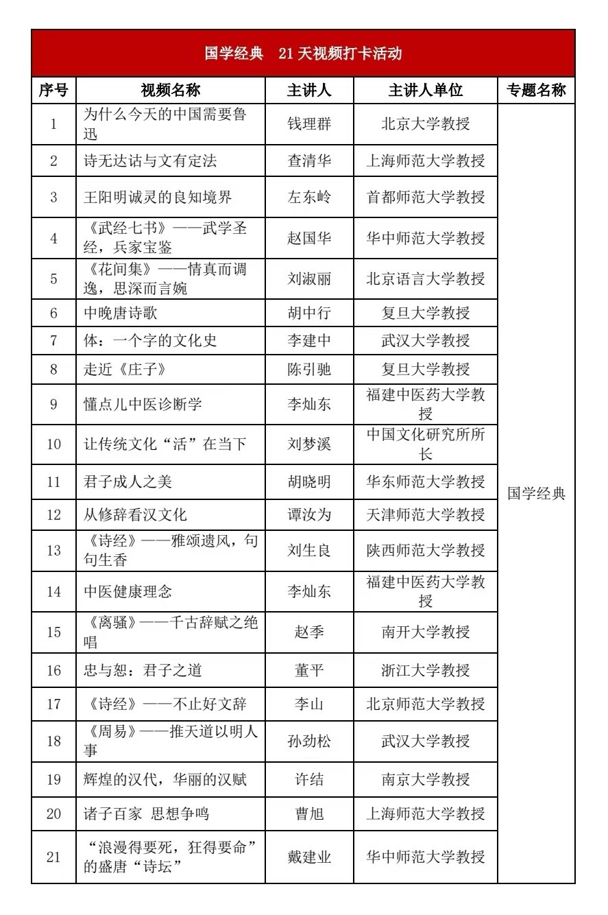 国学,汇通了思想学术、典籍制度、百行百艺、礼仪风俗,蕴含着国脉、国魂、国宝、国本。为了丰富同学们的课余生活,校党委宣传部、图书馆为大家精心准备了国学知识大餐——“每天一讲座,21天打卡活动”,从不同的角度了解国学,了解中华优秀传统文化。