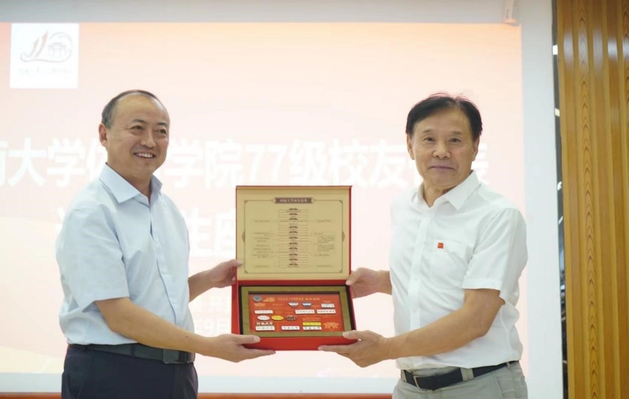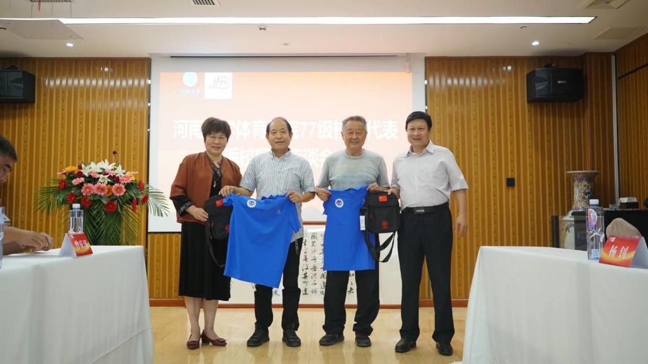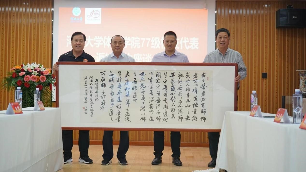 校友河南省体育局原副局长张跃敏、开封市教育体育局原副局长杨钊代表77级校友向体育学院赠送书法作品《师说》,感念师生情。校友郑州大学体育学院(校本部)原院长林克明、河南财经政法大学体育学院原院长崔伟和信阳师范学院体育学院原院长王小美向老教师们献上鲜花并赠送印有专门LOGO的纪念衫、纪念背包。段廷良代表体育学院向77级校友代表赠送开云在线110周年校庆专属纪念品徽章。