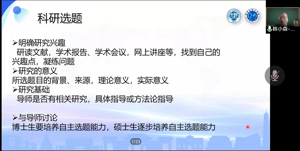 9月5日下午,韩小森以“如何做一名合格的研究生”为主题,首先对学校和学院的基本情况进行了简单介绍,接着阐释了数学学科的重要性和重大意义。然后从设计目标、选择导师、科研态度、科研计划、科研选题、研读文献等方面详细地讲解了如何做数学研究。最后提出了研究生需要具备的6种能力以及需要注意的事项,同时罗列了一些需要学生关注的数学关键词,包括数学科普书籍、常用软件以及菲尔兹奖获得者事迹等。韩小森建议学生们要积极主动、发现问题、注重创新,要在不断学习中发掘自己的感兴趣点,遇到困难,要毫不畏惧去解决它。希望同学们在未来的学习生活中稳步前行!