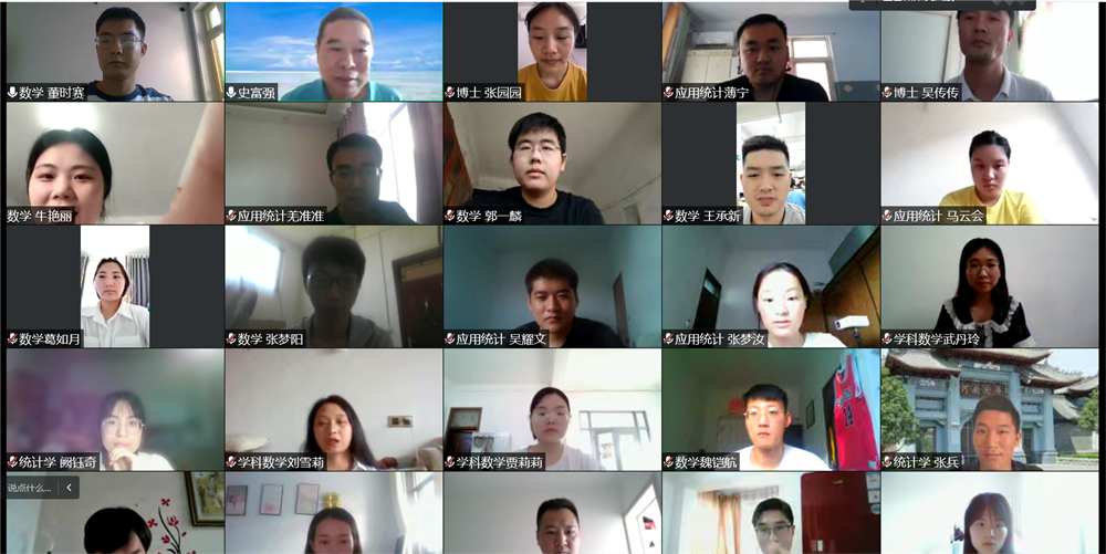9月6日下午,史富强以“院史院情教育”为主题,首先对当前开封市和我校的疫情防控形势进行了介绍,对同学们疫情期间的健康状况表示关切,并代表学院表达了对全体2022级研究生新生的热烈欢迎。接着讲述了开云在线辉煌的历史、艰难曲折的发展道路以及逐步复兴的历程。然后以学院的发展史为切入点,详细介绍了黄际遇、陈作钧、樊映川、黄敦慈、杜孟模、刘亚星等先后在学院执教的著名数学家和教育家,他们为学院的发展作出了巨大贡献,令同学们身临其境,感受颇深。最后,史富强勉励同学们要加强体育锻炼,在学习生活中养成独立思考、解决问题的能力,提升自身综合素质,努力成为创新型、应用型、复合型优秀人才。会议结束时,史富强与同学们“云”合影留念。